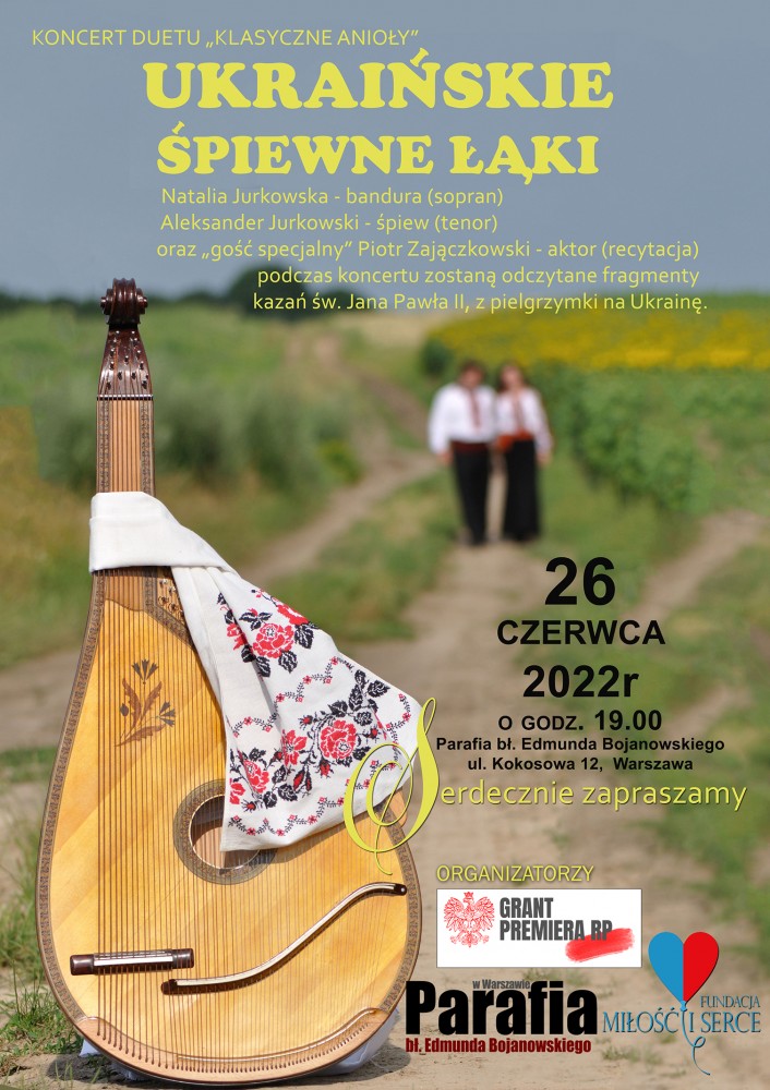 Natalia i Aleksander Jurkowscy, małżeństwo muzyków z Ukrainy, w balladach romantycznych wyśpiewa o miłości, przyjaźni i nadziei. Koncert z akompaniamentem bandury ze zbiórką dla Ukrainy odbędzie się 26 czerwca o 19 w Kościele pw. E. Bojanowskiego, ul. Kokosowa 12 na Ursynowie.