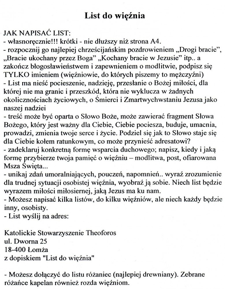 Wyślij list do więźnia. Katolickie Stowarzyszenie Theoforos organizuje wysyłkę listów do więźniów. Napisz i wspomóż osoby przebywające w izolacji. Możesz dołączyć do listu różaniec - najlepiej drewniany. Poniżej apel i wskazówki, jak napisać list i na jaki adres go wysłać.